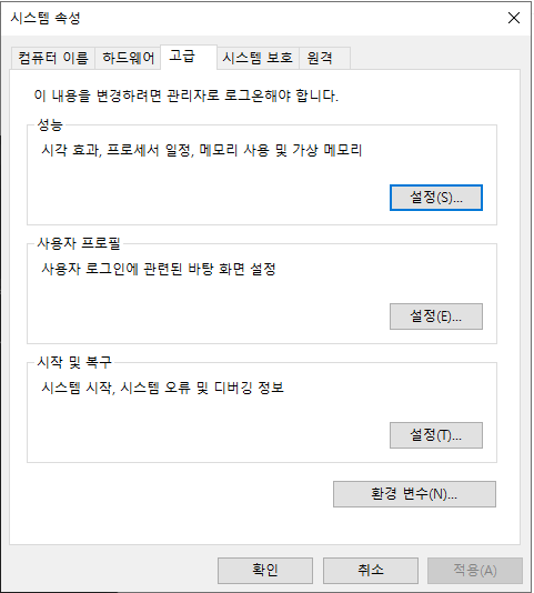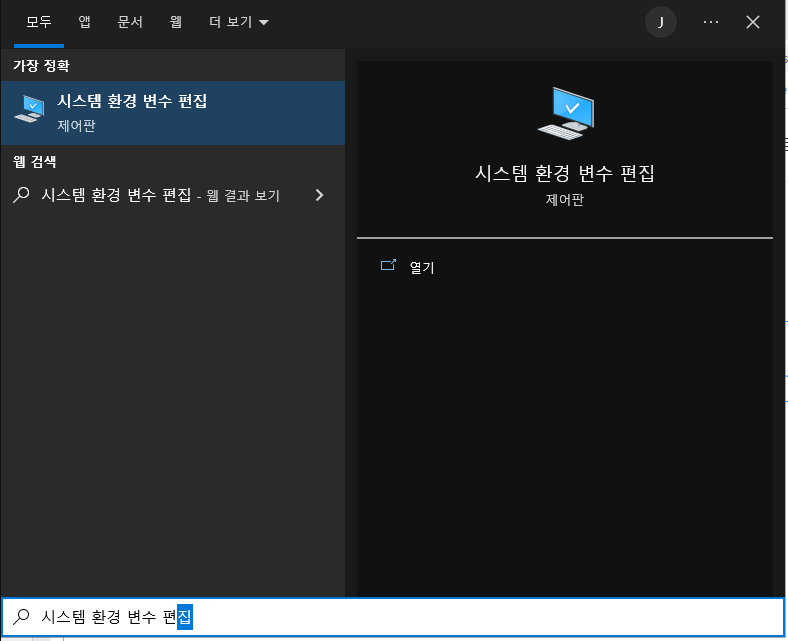 > Window 키를 누르고, "시스템 환경 변수 편집" 검색