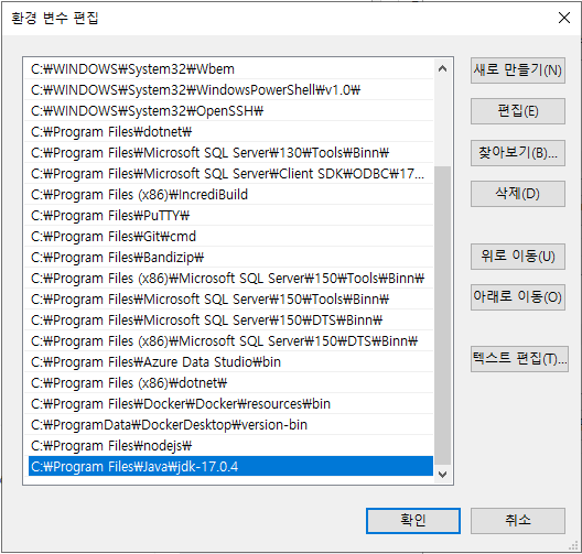 > "새로 만들기"클릭하여 복사해둔 "C:\Program Files\Java\jdk-17.0.4"입력 후 확인