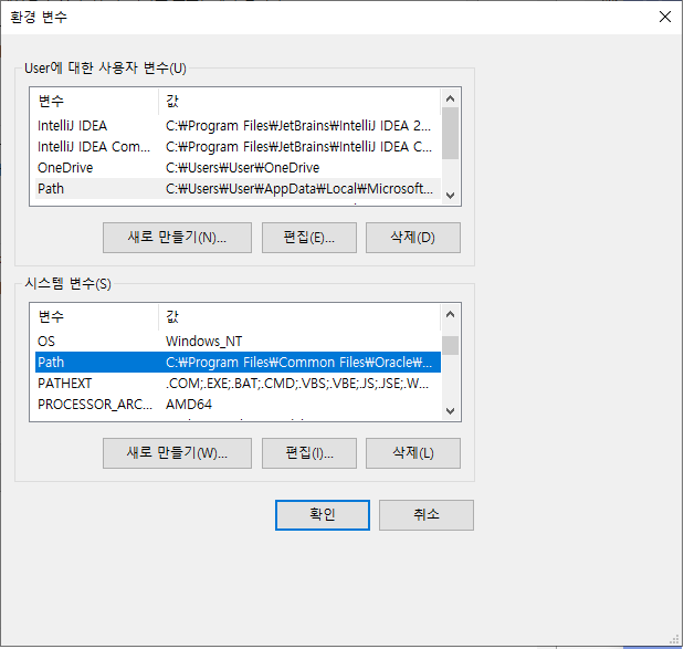 > 시스템 변수 목록 중 "Path"선택 후 편집