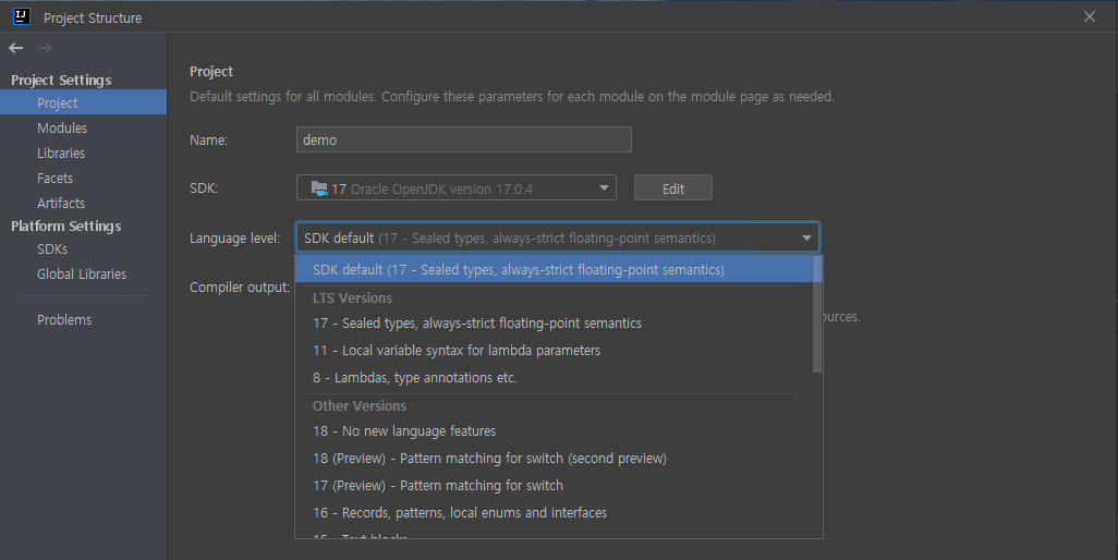 > Project > Language level은 SDK default로 선택하면 SDK에서 선택한 버전 따라갑니다.