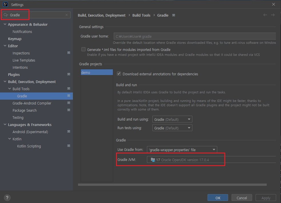 > "Gradle"검색 후 "Gradle JVM"를 17로 선택