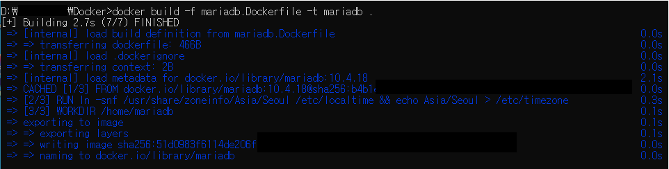 mariadb.Dockerfile파일이 있는 경로로 이동한 뒤 build명령어로 Image를 만들어줍니다.